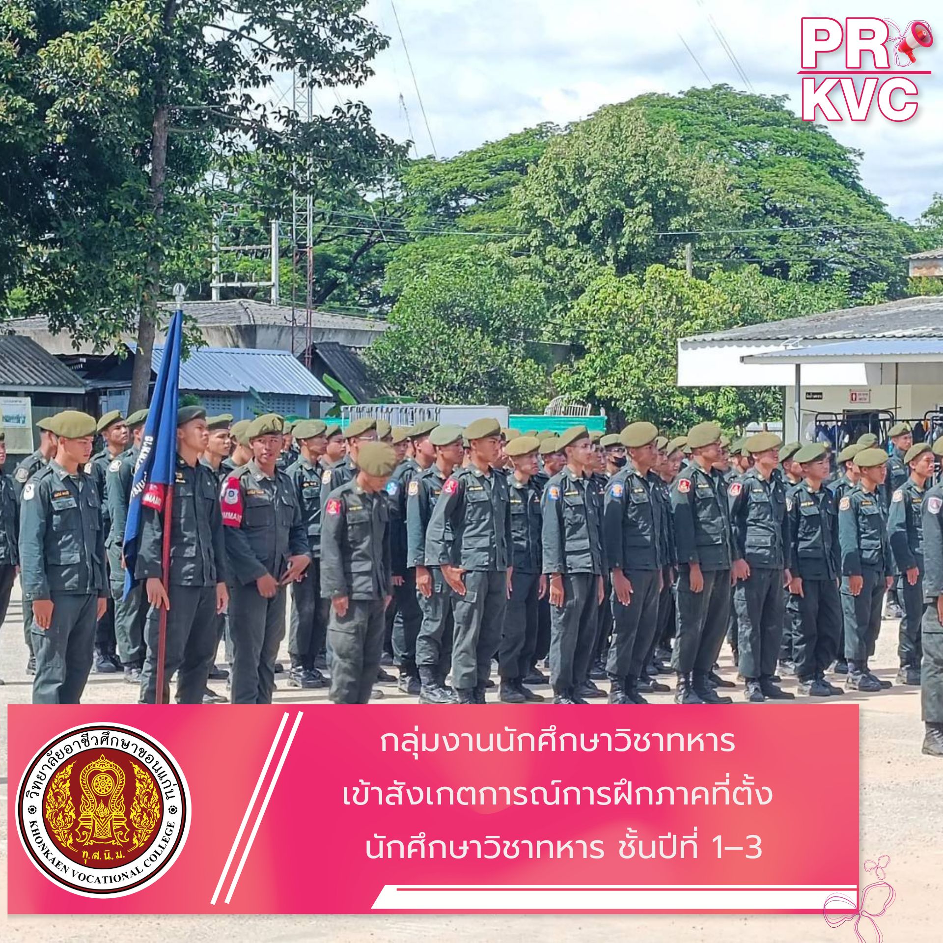 ได้มอบหมายให้ สิบเอก ธำรงชาติ วงศ์อารีย์ กลุ่มงานนักศึกษาวิชาทหาร วิทยาลัยอาชีวศึกษาขอนแก่น เข้าร่วมสังเกตการณ์ การฝึกต่อเนื่องภาคที่ตั้งของนักศึกษาวิชาทหาร (รด.) ชั้นปีที่ 1–3