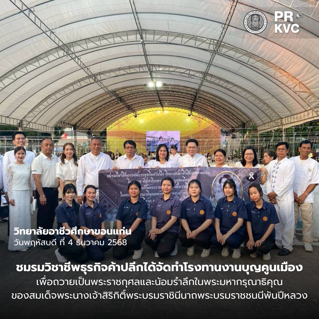 วันที่ 3 ธันวาคม 2568 ชมรมวิชาชีพธุรกิจค้าปลีก วิทยาลัยอาชีวศึกษาขอนแก่น ได้ดำเนินกิจกรรมภายใต้โครงการ “จัดทำโรงทานงานบุญคูนเมือง” เพื่อถวายเป็นพระราชกุศล และน้อมรำลึกในพระมหากรุณาธิคุณของ สมเด็จพระนางเจ้าสิริกิติ์ พระบรมราชินีนาถ พระบรมราชชนนีพันปีหลวง ณ บริเวณศาลหลักเมืองขอนแก่น
