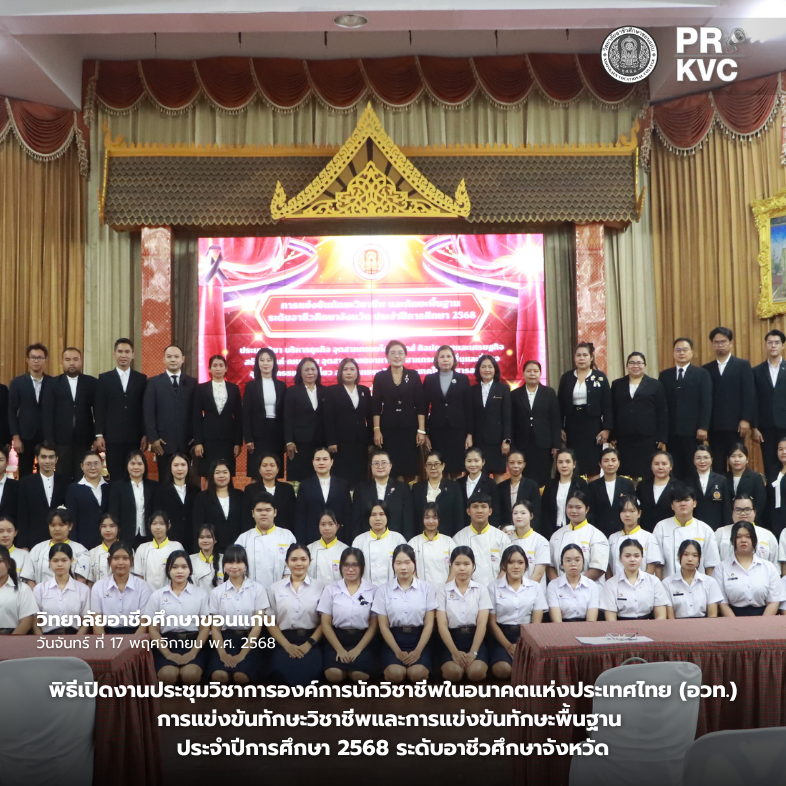 ข่าวประชาสัมพันธ์ วันจันทร์ที่ 17 พฤศจิกายน 2568 พิธีเปิดงานประชุมวิชาการองค์การนักวิชาชีพในอนาคตแห่งประเทศไทย (อวท.) การแข่งขันทักษะวิชาชีพและการแข่งขันทักษะพื้นฐาน ประจำปีการศึกษา 2568 ระดับอาชีวศึกษาจังหวัด ณ หอประชุมแก่นคำ วิทยาลัยอาชีวศึกษาขอนแก่น