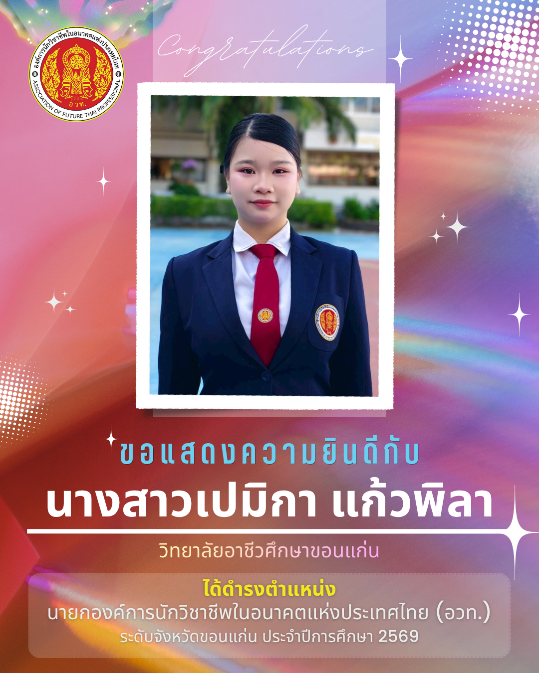 ร่วมแสดงความยินดีกับ นางสาวเปมิกา แก้วพิลา ได้ดำรงตำแหน่ง นายกองค์การนักวิชาชีพในอนาคตแห่งประเทศไทย (อวท.) ระดับจังหวัดขอนแก่น