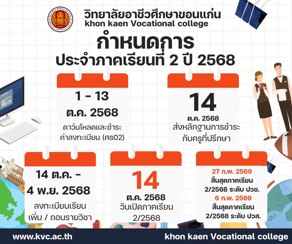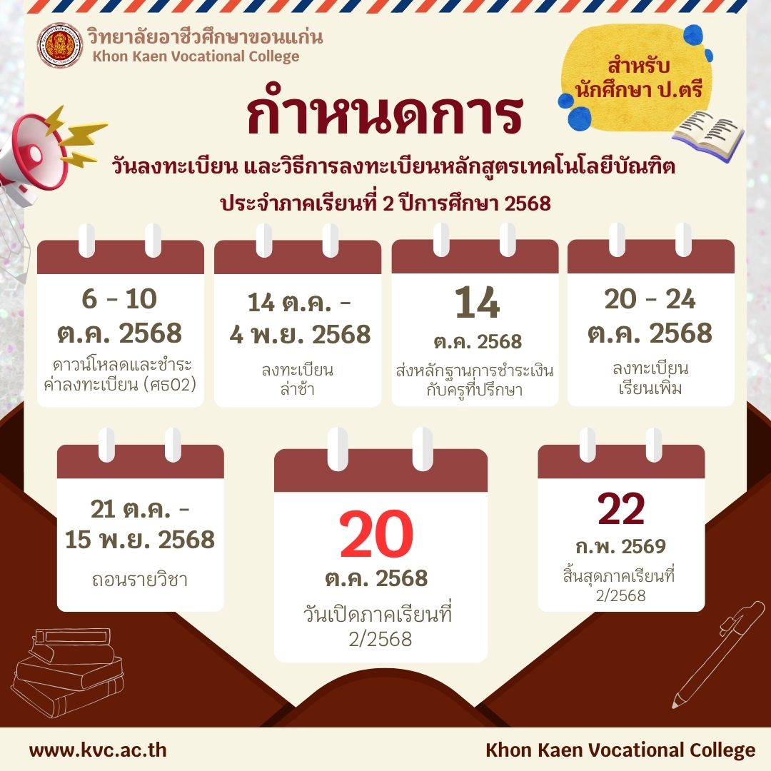 วิทยาลัยอาชีวศึกษาขอนแก่น ประกาศกำหนดการวันลงทะเบียน และวิธีการลงทะเบียนหลักสูตรเทคโนโลยีบัณฑิต ประจำภาคเรียนที่ 2 ปีการศึกษา 2568