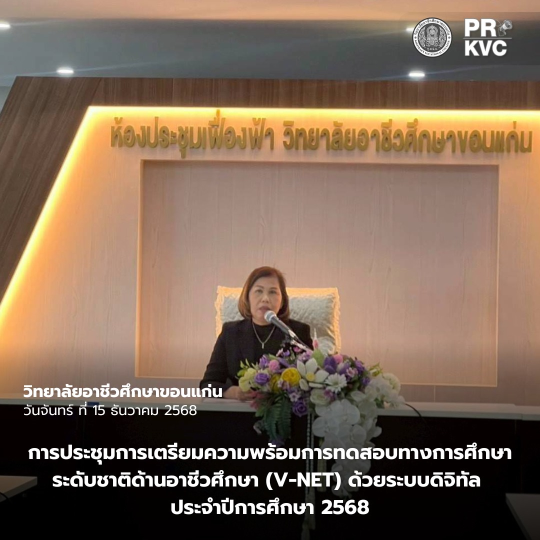 ดร. สิริรัชนา เนาว์โสภา ผู้อำนวยการวิทยาลัยอาชีวศึกษาขอนแก่น มอบหมายให้ นางอารีย์ มูลดามาตย์ รองผู้อำนวยการฝ่ายวิชาการ จัดประชุมการเตรียมความพร้อม