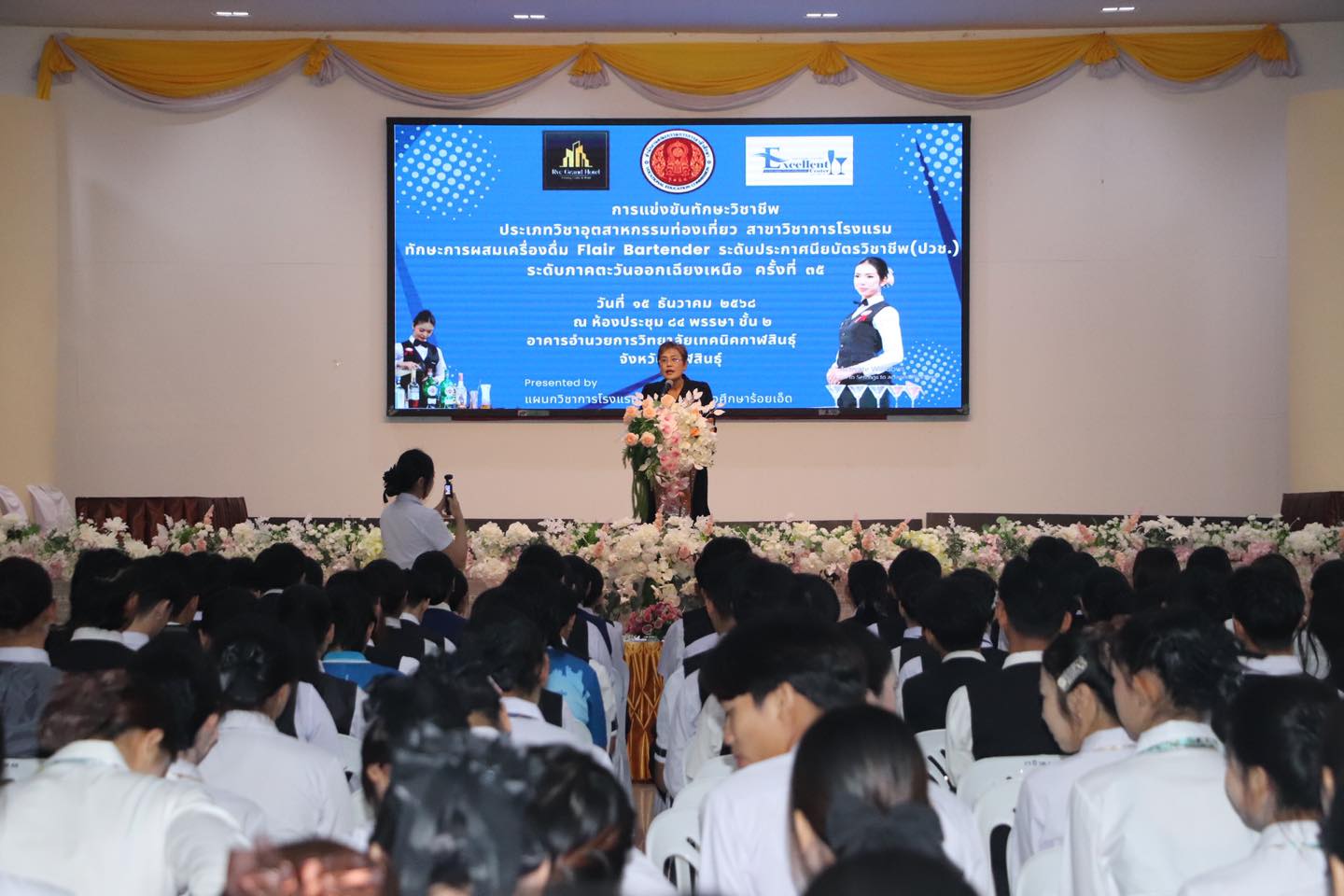 ดร.สิริรัชนา เนาว์โสภา ผู้อำนวยการวิทยาลัยอาชีวศึกษาขอนแก่น ให้เกียรติเป็นประธานในพิธีเปิดการแข่งขันทักษะการผสมเครื่องดื่ม ประเภท Flair Bartender ระดับประกาศนียบัตรวิชาชีพ (ปวช.)