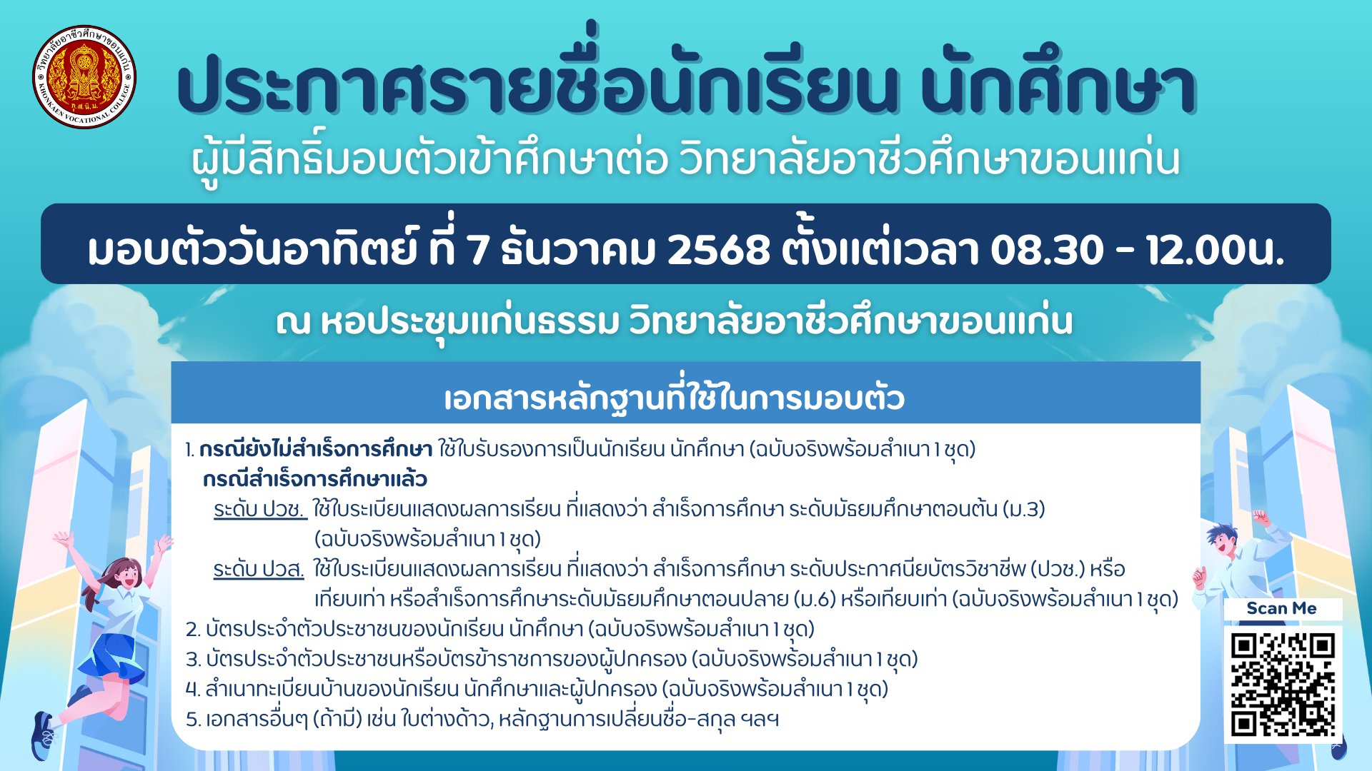 📣ประกาศรายชื่อนักเรียน นักศึกษา ผู้มีสิทธิ์มอบตัวเข้าศึกษาต่อ วิทยาลัยอาชีวศึกษาขอนแก่น