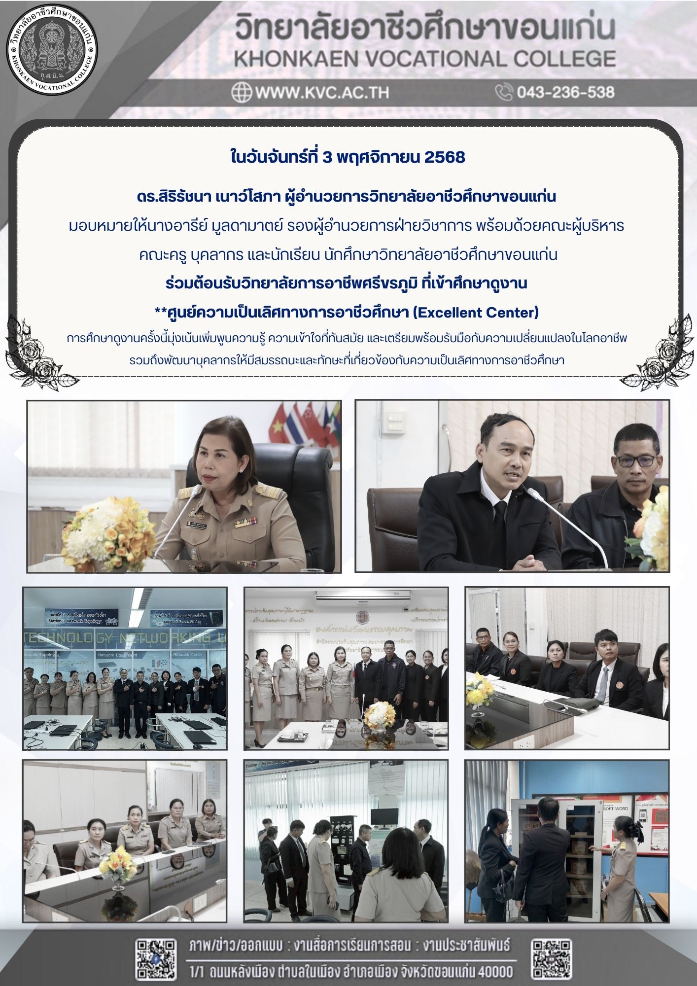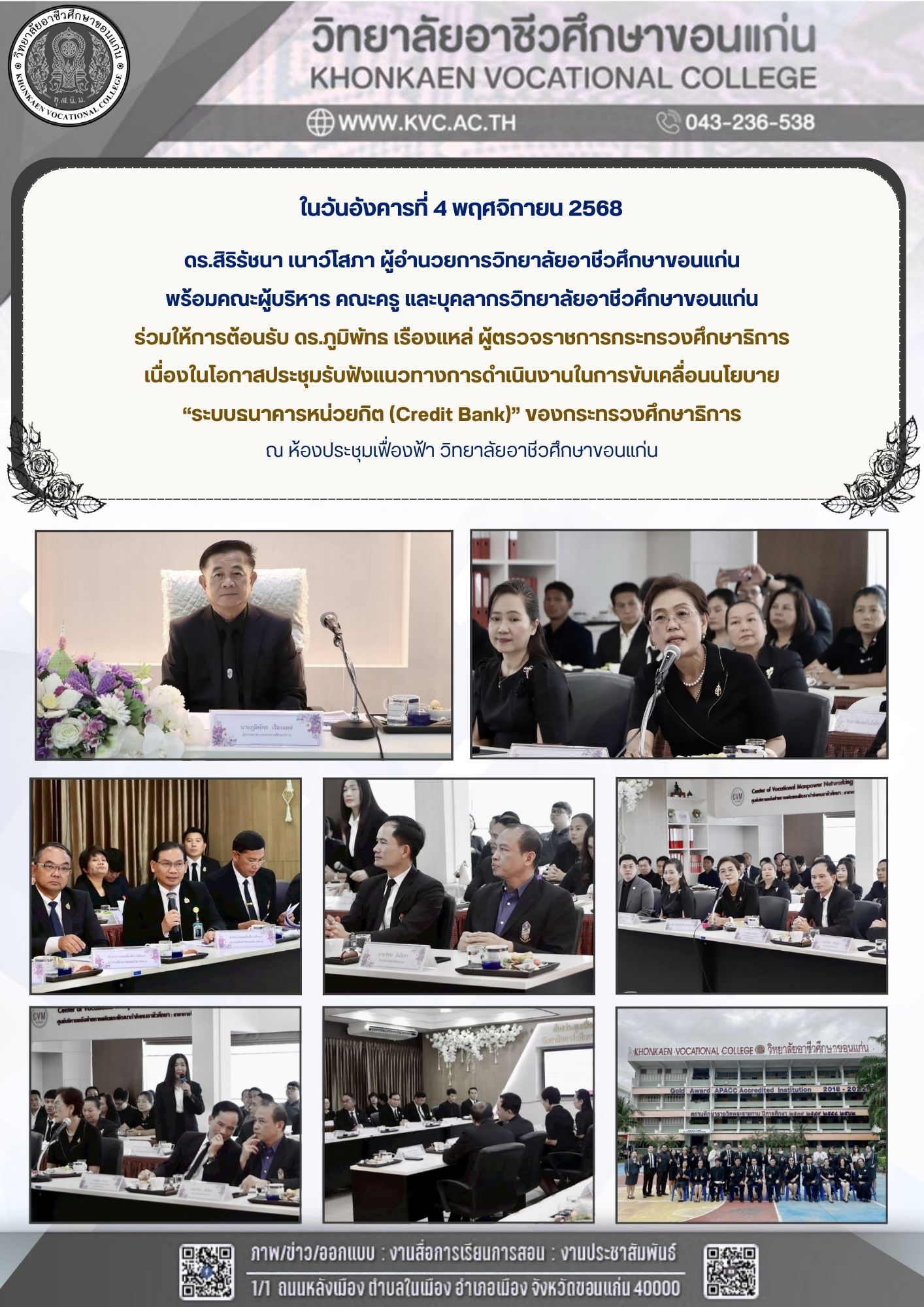 วิทยาลัยอาชีวศึกษาขอนแก่น ร่วมให้การต้อนรับ ดร.ภูมิพัทธ เรืองแหล่ ผู้ตรวจราชการกระทรวงศึกษาธิการ เนื่องในโอกาสประชุมรับฟังแนวทางการดำเนินงานในการขับเคลื่อนนโยบาย “ระบบธนาคารหน่วยกิต (Credit Bank)” ของกระทรวงศึกษาธิการ
