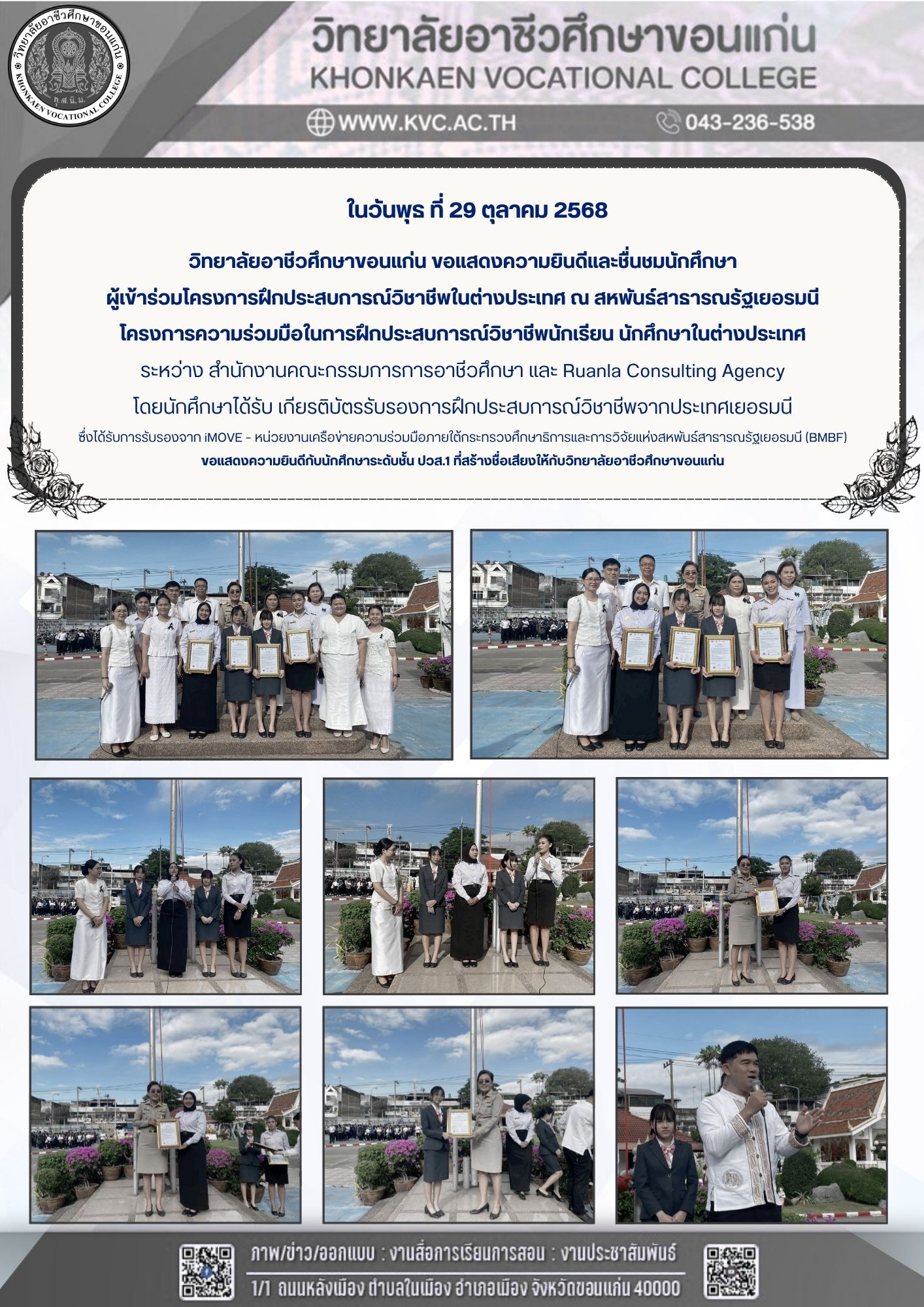โครงการความร่วมมือในการฝึกประสบการณ์วิชาชีพนักเรียน นักศึกษาในต่างประเทศระหว่าง สำนักงานคณะกรรมการการอาชีวศึกษา และ Ruanla Consulting Agency โดยนักศึกษาได้รับ เกียรติบัตรรับรองการฝึกประสบการณ์วิชาชีพจากประเทศเยอรมนี ซึ่งได้รับการรับรองจาก IMOVE – หน่วยงานเครือข่ายความร่วมมือภายใต้กระทรวงศึกษาธิการและการวิจัยแห่งสหพันธ์สาธารณรัฐเยอรมนี (BMBF) ขอแสดงความยินดีกับนักศึกษาระดับชั้น ปวส.1 ที่สร้างชื่อเสียงให้กับวิทยาลัยอาชีวศึกษาขอนแก่น 💐