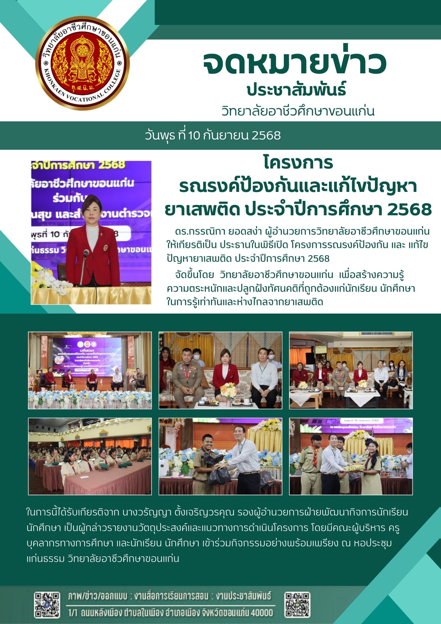 วันพุธที่ 10 กันยายน 2568 โครงการรณรงค์ป้องกันและแก้ไขปัญหายาเสพติด ประจำปีการศึกษา 2568 ดร.กรรณิกา ยอดสง่า ผู้อำนวยการวิทยาลัยอาชีวศึกษาขอนแก่น ให้เกียรติเป็น ประธานในพิธีเปิด โครงการรณรงค์ป้องกัน และ แก้ไขปัญหายาเสพติด ประจำปีการศึกษา 2568 จัดขึ้นโดย วิทยาลัยอาชีวศึกษาขอนแก่น เพื่อสร้างความรู้ ความตระหนักและปลูกฝังทัศนคติที่ถูกต้องแก่นักเรียน นักศึกษาในการรู้เท่าทันและห่างไกลจากยาเสพติด